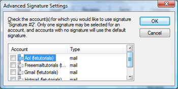 Select the checkbox corresponding to the email accounts you want to tie with the selected email signature, and click OK. You're done! (Don't forget to click OK to close Windows Live Mail's Options dialog to confirm your changes.)