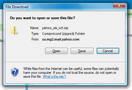 If you choose "vCard, Zip of .VCF files", Yahoo Mail will create a zipped archive (ZIP file) containing a vCard for each of your contacts; this is the slowest contacts export method, since Yahoo has to generate a vCard for each contact in your address book, and send them as a zip file download to you.